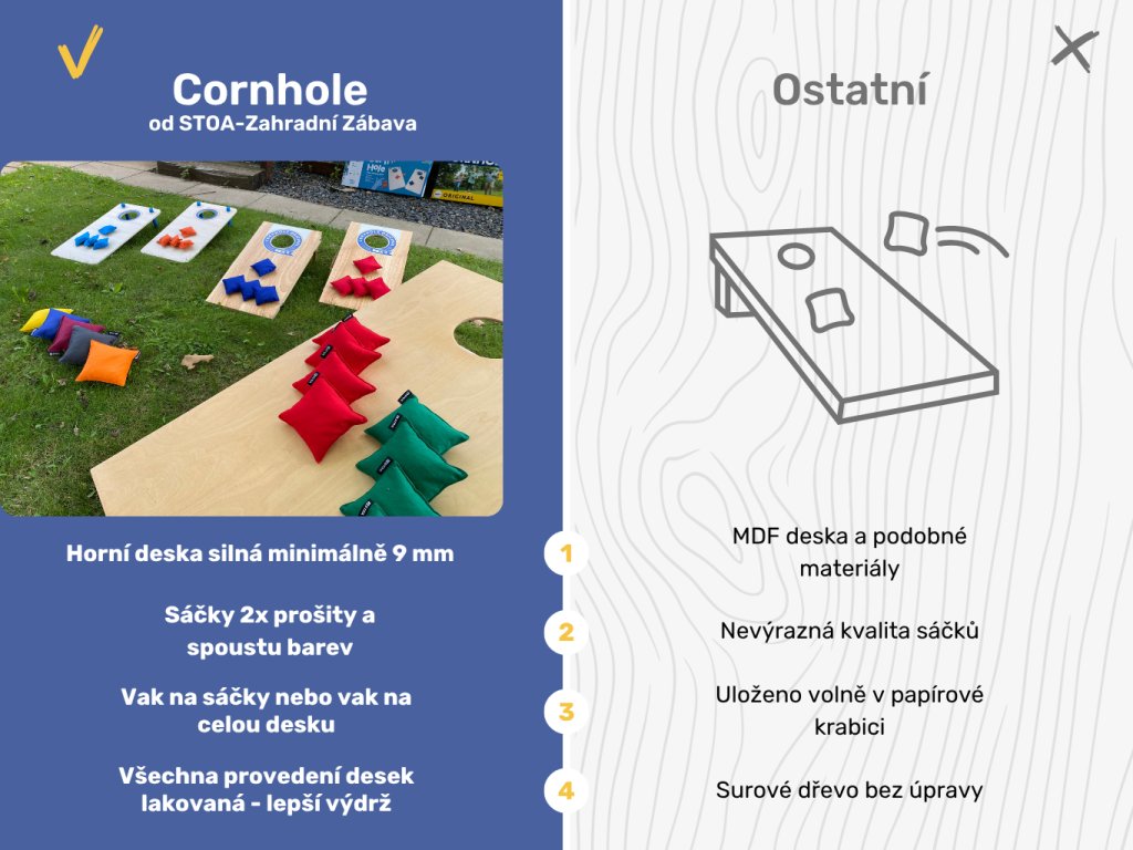 - Cornhole deska je vyrobena ze 100% březové překližky. Precizní vzhled desky je základ! Nikde žádné koukající šrouby... Deska je kvalitně smirkována pro hladký "slajd" sáčku. Skládací nohy připevněné přímo na desce zajistí kompaktní skladování.