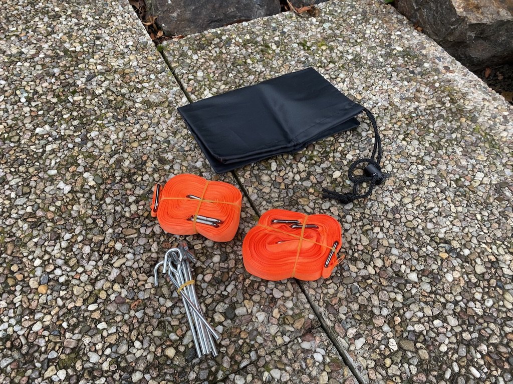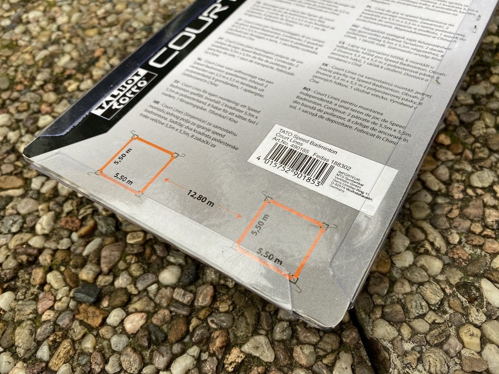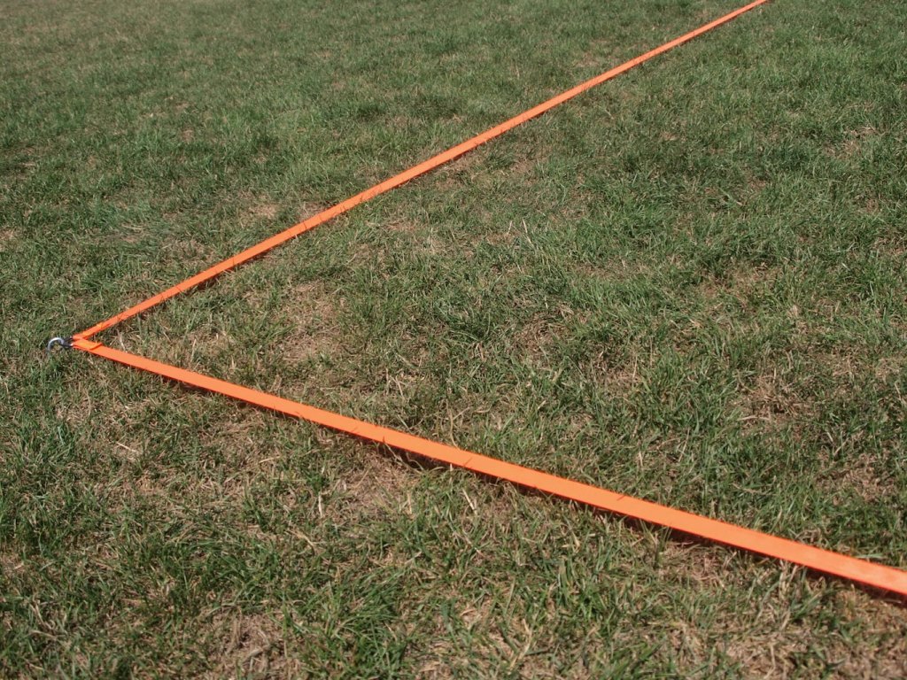 - Velikost čtverce je 5,5 m. Lajny jsou dobře vidět v trávě a do země je lze přikotvit přiloženými kolíky.