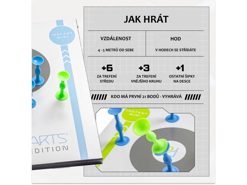 Hráči získají 3 body za úplné přistání uvnitř šedého terče a 1 bod za další Popdarts, které se přisaje k desce. 6 bodů za střed! Díky odečítacímu bodování, které znáte z Cornhole se body mezi týmy vyrovnávají (první tým zahraje v kole součet 5, druhý 3 body = první tým si započítá rozdíl, tedy 2 body). Kdo první dosáhne 21 bodů, vyhrává!