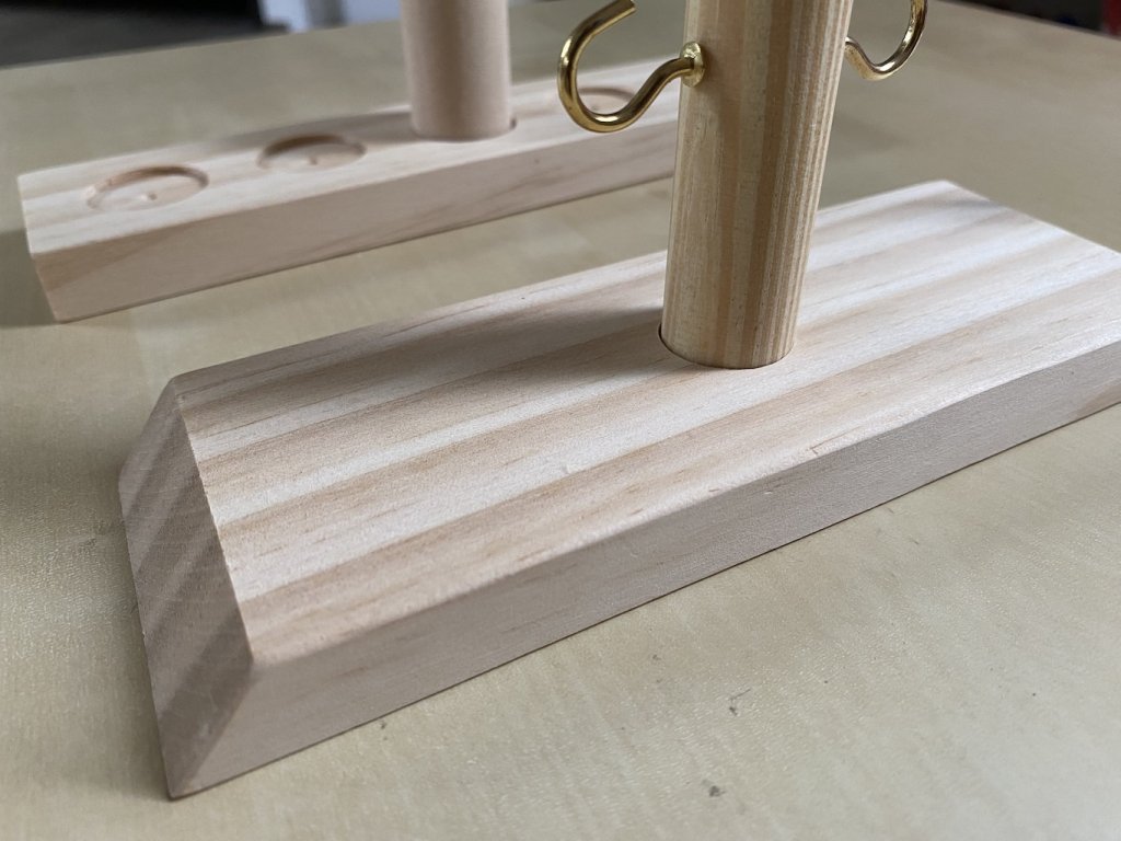 - 1 hrací stojánek, 1 houpačka s dvěma háčky (ty zahákňete tak, aby se skoro chytly o ocka), 2 dřevěné válečky.