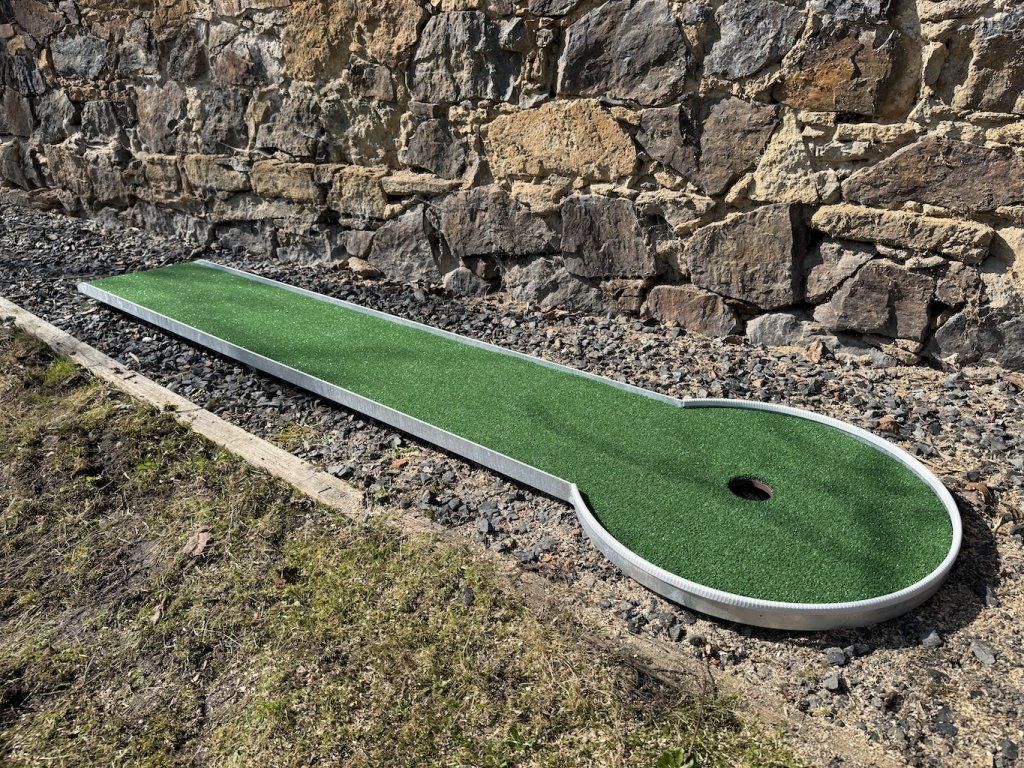 Malá minigolfová dráha (délka 2,5 m) + základní sada překážek. Malé provedení zahradního minigolfu.